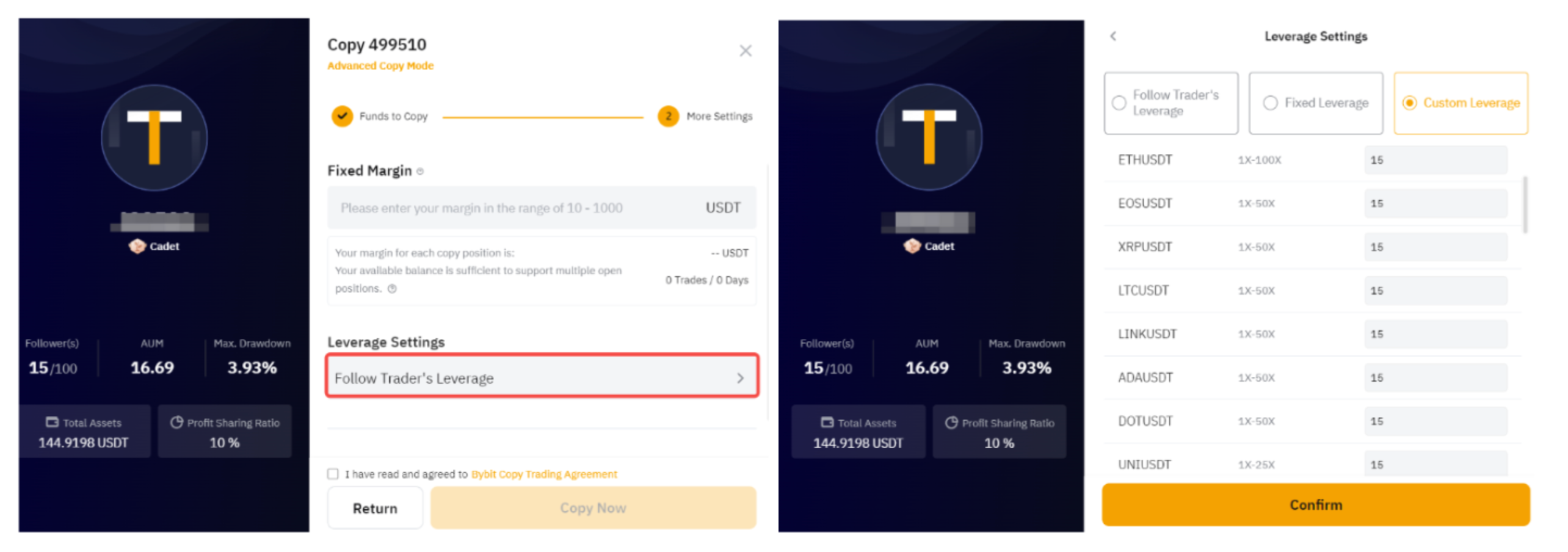 Підписники можуть збільшити суму інвестицій на Майстра трейдингу, і коли Майстер трейдингу здійснить нову торгову дію, наприклад, розмістить новий ордер або змінить кредитне плече, то кредитне плече буде автоматично вирівняно. Однак, якщо Майстер трейдингу не зробить жодної нової торгової дії, система не буде автоматично оновлювати зміну кредитного плеча для Підписників. У цьому випадку ви можете вручну змінити своє кредитне плече за кредитним плечем Майстра трейдингу, перейшовши до відповідного Майстра трейдингу в Налаштування копітрейдингу і натиснувши Встановити параметри. Це дозволить системі повторно перевірити доступну маржу та змінити кредитне плече.