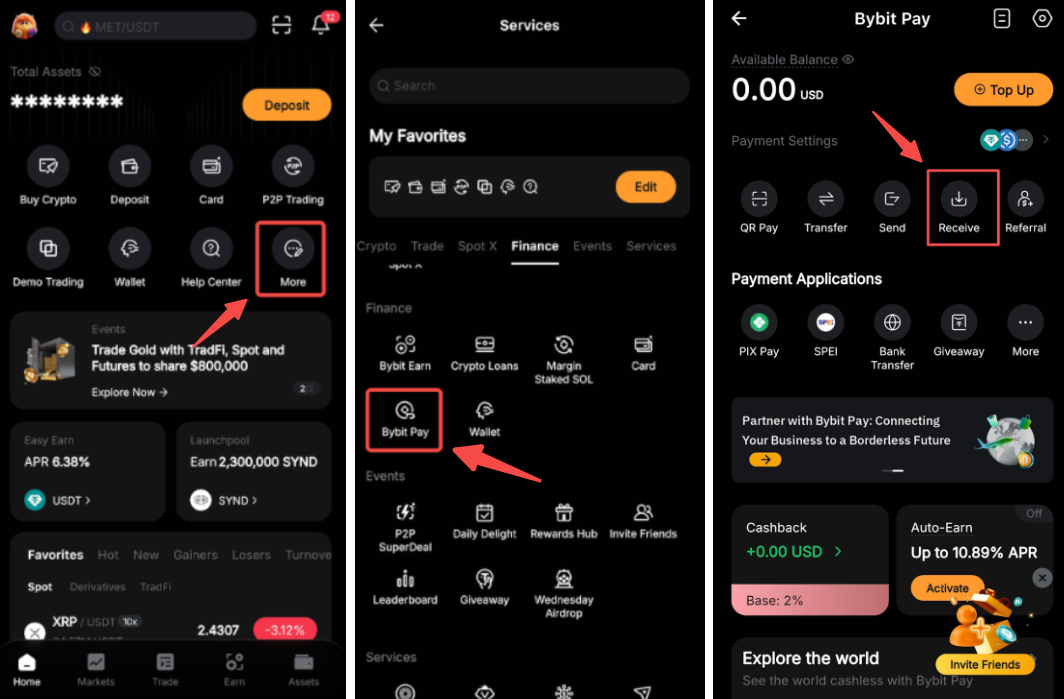Крок 1. Увійдіть у застосунок Bybit і торкніться БільшеBybit Pay Отримую.