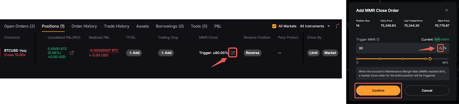 2. Створення ордеру закриття для MMR для часткової кількості позиції не підтримується, і для кожної позиції можна встановити лише один ордер закриття для MMR.