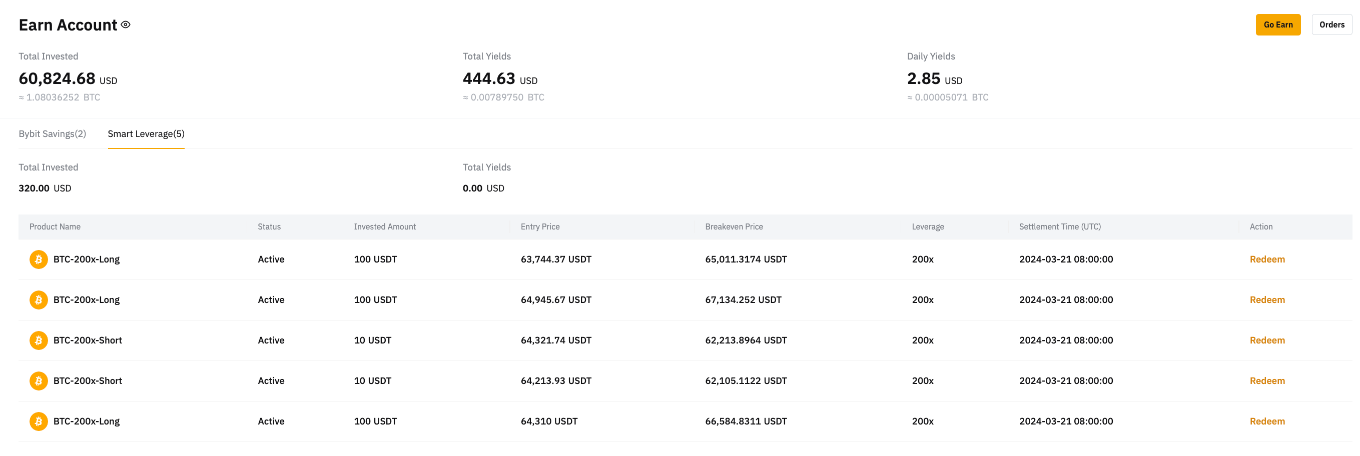 Truy cập trang Đòn Bẩy Thông Minh Bybit bằng cách nhấp vào Tài Chính EarnĐòn Bẩy Thông Minh trong thanh điều hướng.