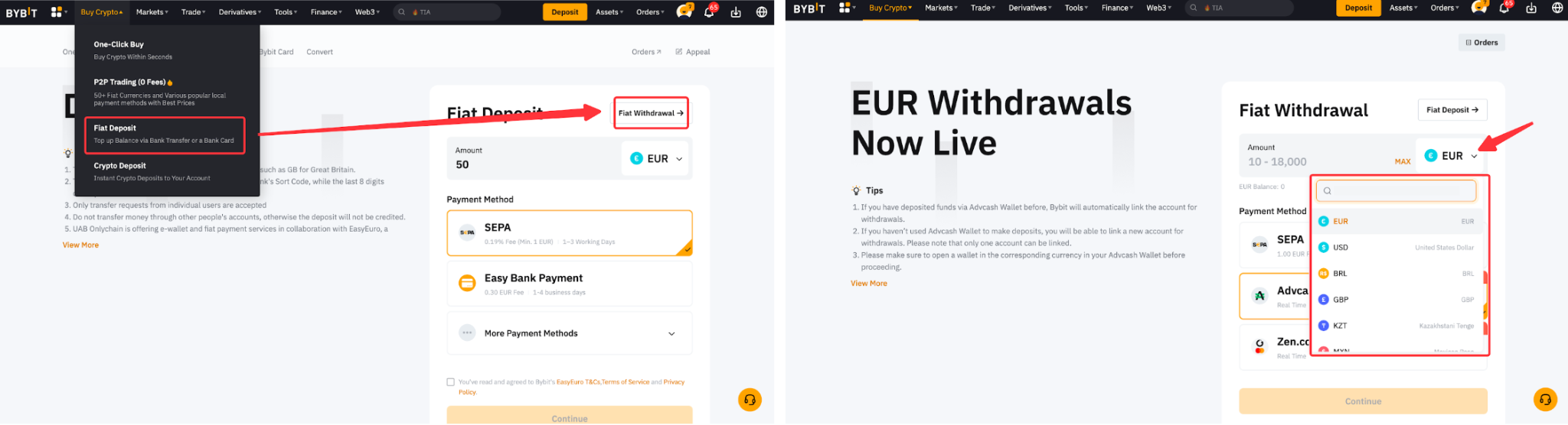 Bybit 仅支持一定种类的法币提币。您可以在法币提币页面查看法币提币支持的法币。
