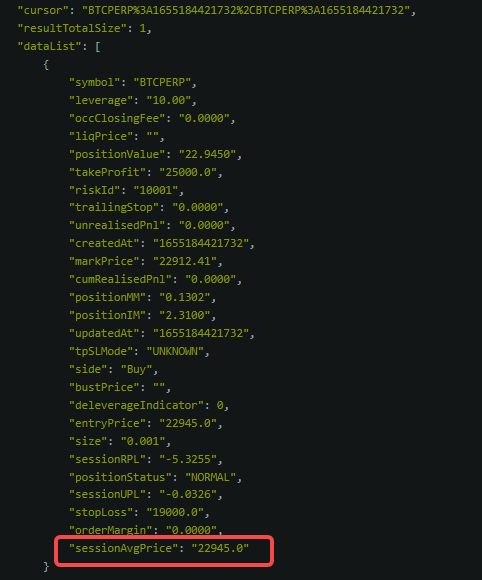 關於 USDC 合約 V3 API 的回應參數,請參閱 sessionAvgPrice 以了解 USDC 永續合約的平均開倉價格。到達結算時間後,sessionAvgPrice (平均開倉價格) 將更新為結算時的標記價格。建議您使用此處更新的 API