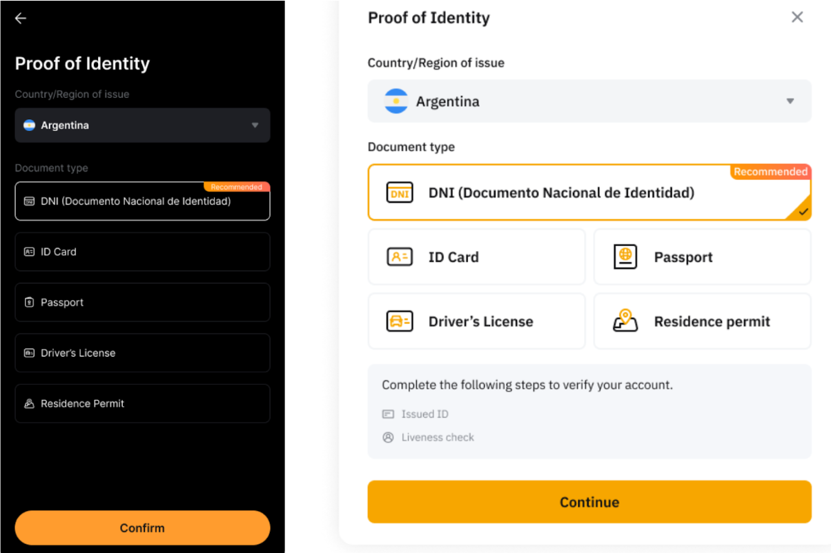 阿根廷居民可以使用當地文件類型完成身份驗證:DNI(Documento Nacional de Identidad)。