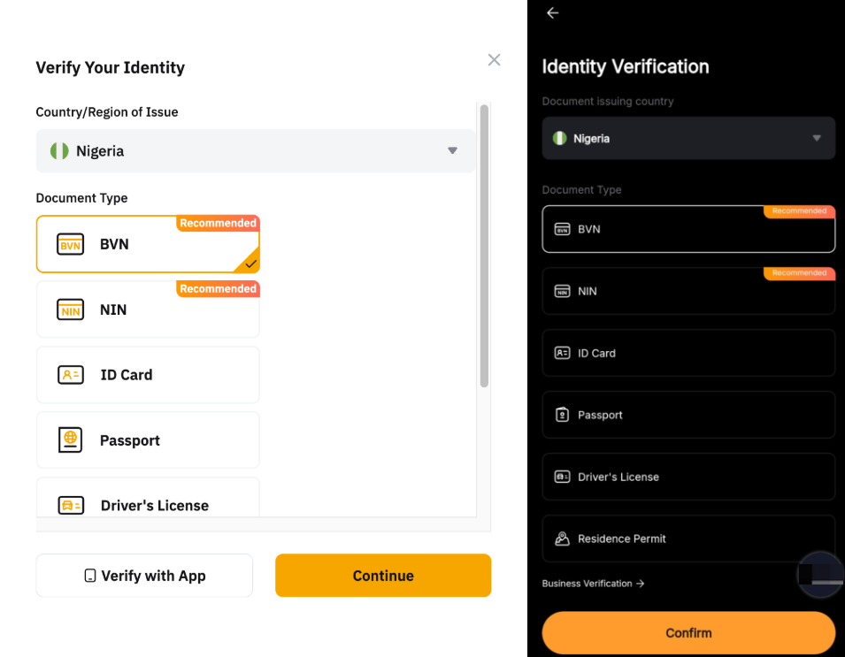 尼日利亞居民支援兩 (2) 種本地證件認證類型:銀行驗證碼 (BVN) 和身分證字號 (NIN)。