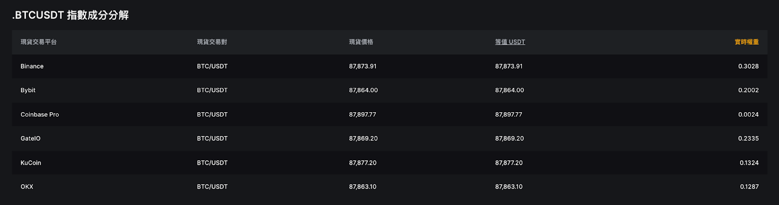 指數價格由 3 大變量決定:現貨價格、等值USDT價格和實時權重。