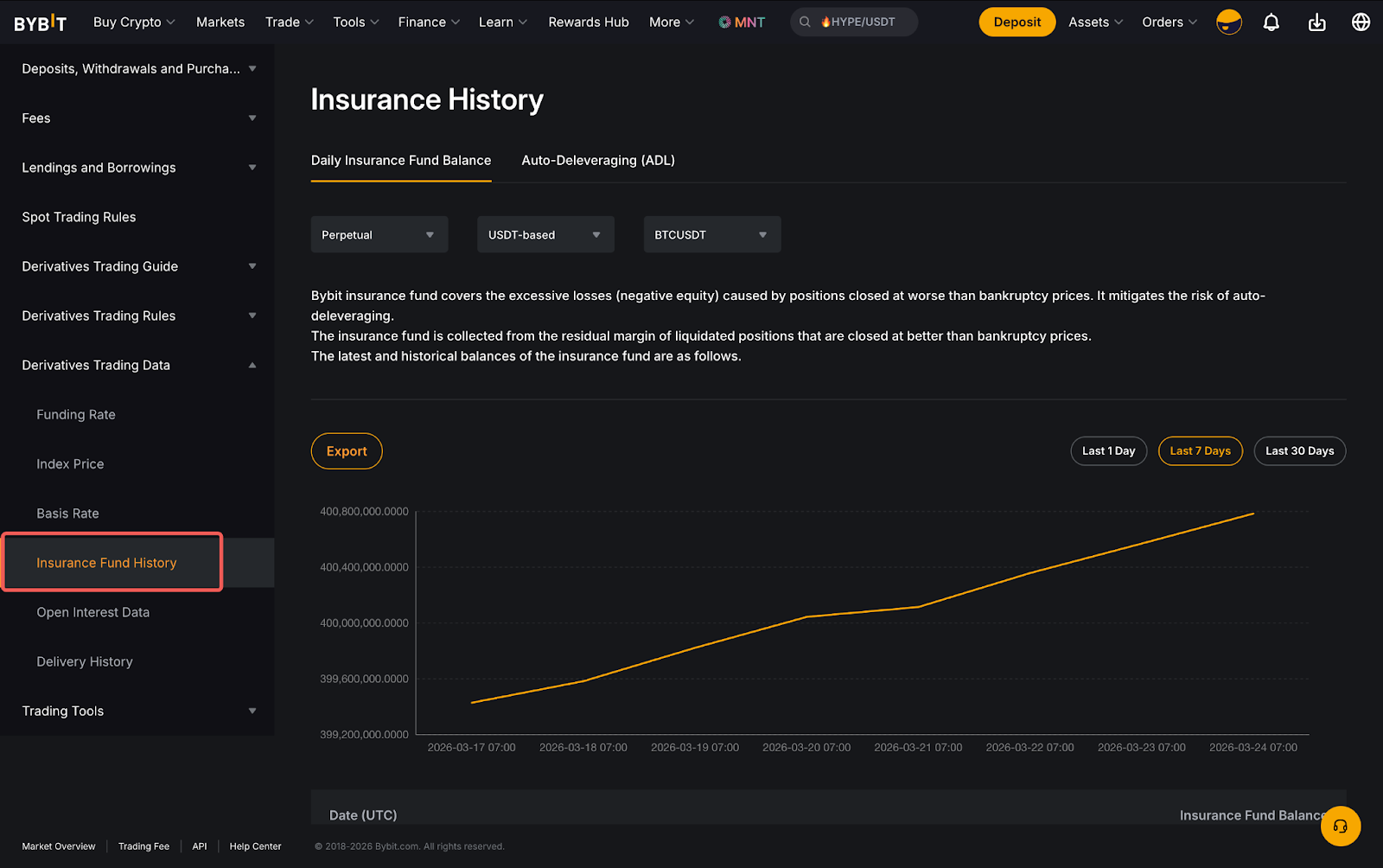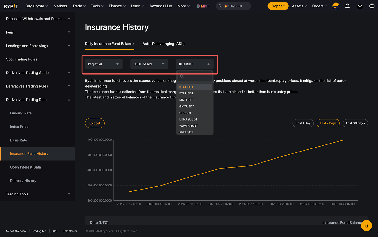 要查看所有永續和交割合約的 Bybit 保險基金餘額,請前往 Bybit 市場行情,然後選擇保險基金歷史